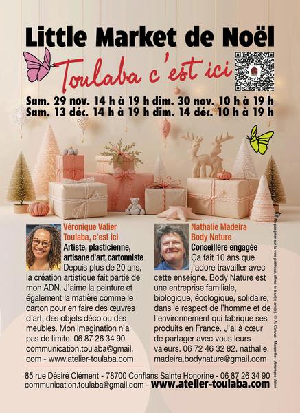 Description | Dans la bâtisse de 1834 transformée en maison-atelier, Véronique ouvre un univers singulier entièrement consacré à l’art et à l’artisanat d’art. Peintures, objets façonnés à la main, pièces originales et savoir-faire authentiques dessinent une atmosphère chaleureuse, propice à la découverte. À cette immersion créative s’ajoute la présence de Nathalie, spécialiste bien-être chez Body Nature, qui partage ses conseils et son approche naturelle du soin au quotidien. Ici, Toulaba, c’est un rendez-vous incontournable pour trouver des cadeaux de Noël uniques, faits main et fabriqués en France, dans une ambiance intimiste et accueillante. Entrée libre pour flâner, admirer et dénicher de véritables trésors artisanaux. |