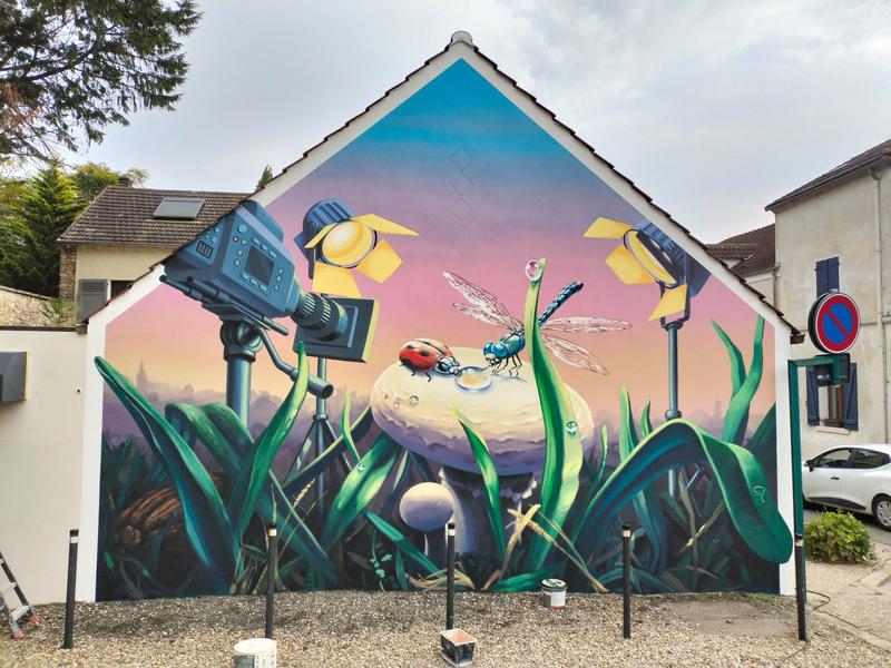 Description | Et... Action ! Les passants, discrètement cachés dans les herbes hautes derrière la caméra, observent la scène comme s'ils étaient redevenus enfants. Je ne vous révélerai pas la fin, mais imaginez un scénario classique : que se passera-t-il lorsqu'ils auront tous deux partagé cette goutte d'eau ? Peut-être une scène digne de « La Belle et le Clochard ». En créant cette maquette, j'ai voulu donner aux spectateurs l'impression de rétrécir, en mettant en avant la grandeur de la nature. Cette perspective apporte une dimension fantastique qui stimule l'imaginaire et invite à réfléchir sur la relation entre l'homme et la nature. De nombreuses références audiovisuelles explorent ce thème de l'échelle, comme « Chérie, j'ai rétréci les gosses », « Alice au pays des merveilles », « Minuscule » ou encore le film « Downsizing ». Je mentionne ces inspirations car cette œuvre est une référence directe au cinéma, en hommage aux nombreux tournages qui ont eu lieu à Évecquemont et au projet de la fondation « Arts Animés » d'installer ses studios de tournage de stop motion dans la commune. Coupez ! Entouré d'artistes dès son plus jeune âge, Raphaël Poron, commence à dessiner à 5 ans et poursuit sa formation aux Beaux-Arts de Troyes et à l'Institut Saint Luc à Tournai, avant de se spécialiser dans l'art mural à l'Atelier des Peintres. Depuis 17 ans, il exerce ce métier passionnant, utilisant diverses techniques pour créer des œuvres qui touchent et marquent un large public, en apportant du rêve, des histoires et des messages. |