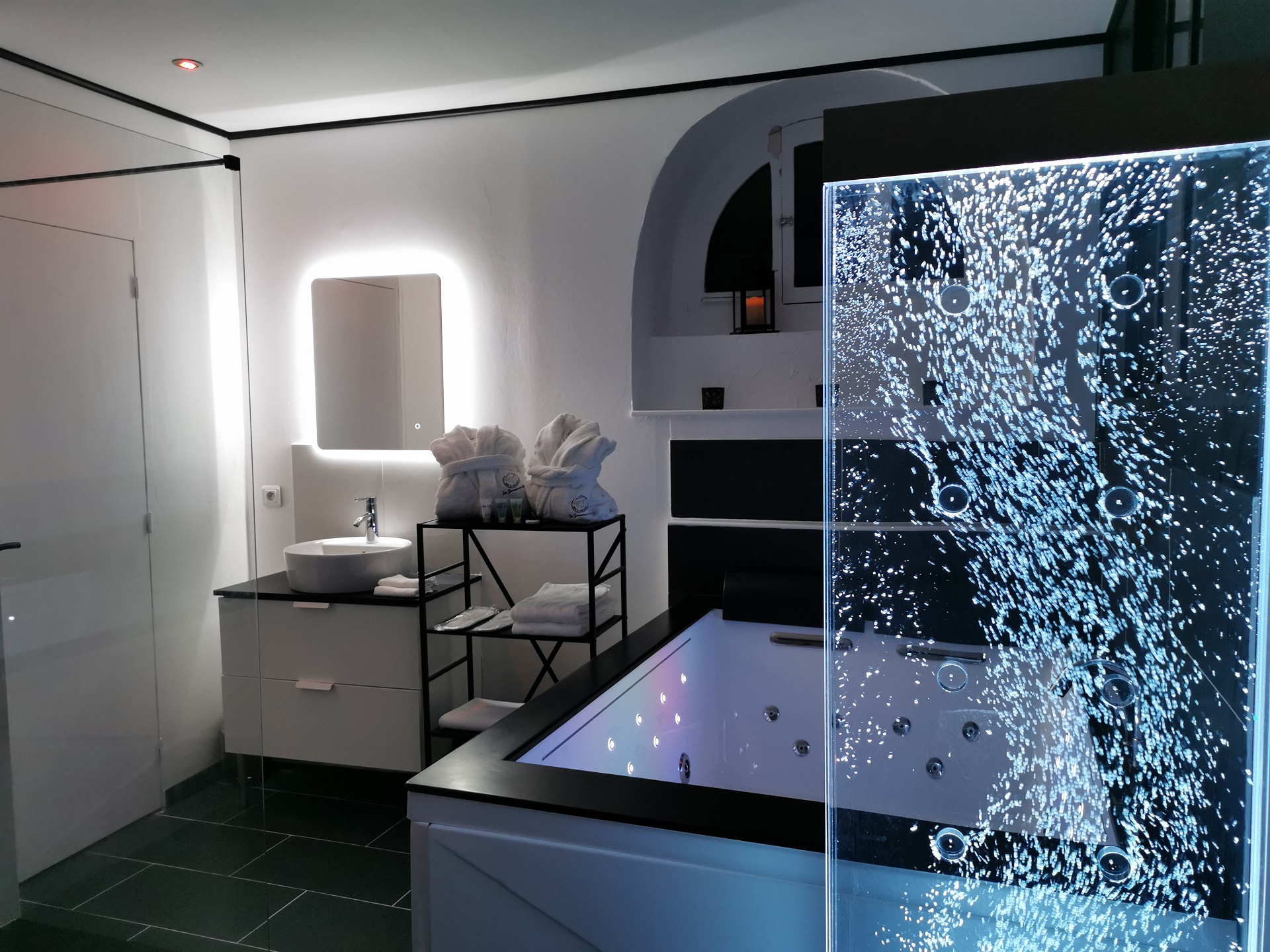 Ici vous êtes ailleurs et les propriétaires vous proposent toute une gamme de services pour votre plus grand plaisir. Et surtout, abusez de la baignoire balnéo, conçue pour deux personnes, dotée de buses qui procurent un massage en douceur.. avec ou sans remous. Et pour accompagner le moment, une dose de luminothérapie, un système audio pour diffuser votre playlist… bref .. abandonnez vous.